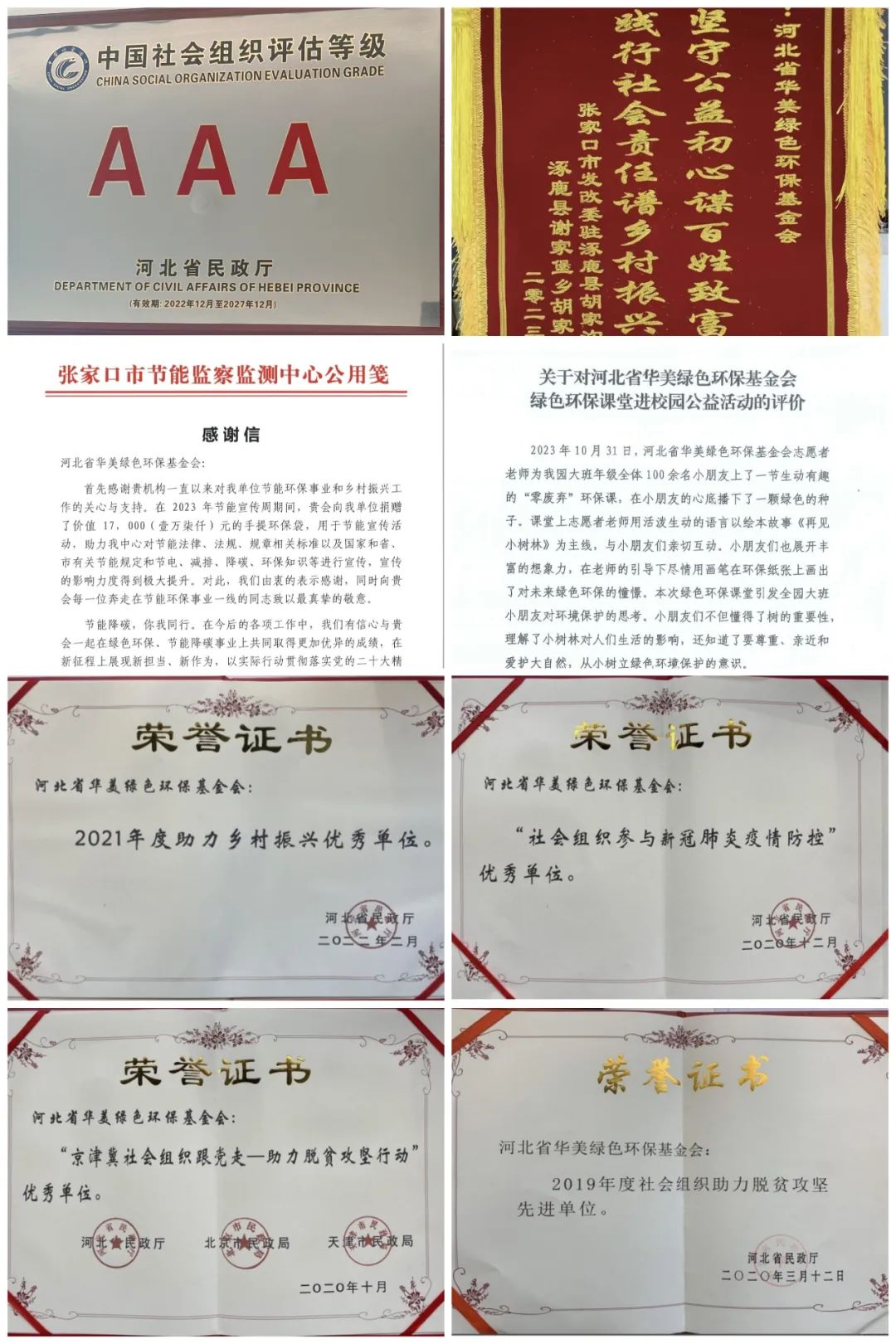 2019年被河北省民政廳授予“社會(huì)組織扶貧攻堅(jiān)行動(dòng)”先進(jìn)單位稱號(hào);2020年獲得河北省民政廳、北京市民政局、天津市民政局聯(lián)合頒發(fā)的“京津冀社會(huì)組織跟黨走—助力脫貧攻堅(jiān)行動(dòng)”優(yōu)秀單位證書,同時(shí),獲得省民政廳授予的“社會(huì)組織參與新冠肺炎疫情防控”優(yōu)秀單位稱號(hào);2021年獲得省民政廳授予的“助力鄉(xiāng)村振興”優(yōu)秀單位稱號(hào);2020年3月收到湖北省黃岡市感謝信;收到公羊會(huì)公益基金會(huì)感謝視頻;收到共同行動(dòng)助學(xué)基金會(huì)感謝信;2021年收到中華救助基金會(huì)捐贈(zèng)感謝證書;2022年收到張家口市陽原縣西城鎮(zhèn)黃糧坡中心學(xué)校、張家口市涿鹿縣謝家堡鄉(xiāng)胡家溝村村委會(huì)及張家口市發(fā)展和改革委員會(huì)的評(píng)價(jià)信、感謝信及榮譽(yù)錦旗。2023年收到張家口市節(jié)能監(jiān)察監(jiān)測中心、北京市東城區(qū)西河沿社區(qū)、張家口橋西區(qū)長青路小學(xué)、永豐堡小學(xué)、第二幼兒園等單位的感謝信、評(píng)價(jià)信及錦旗。